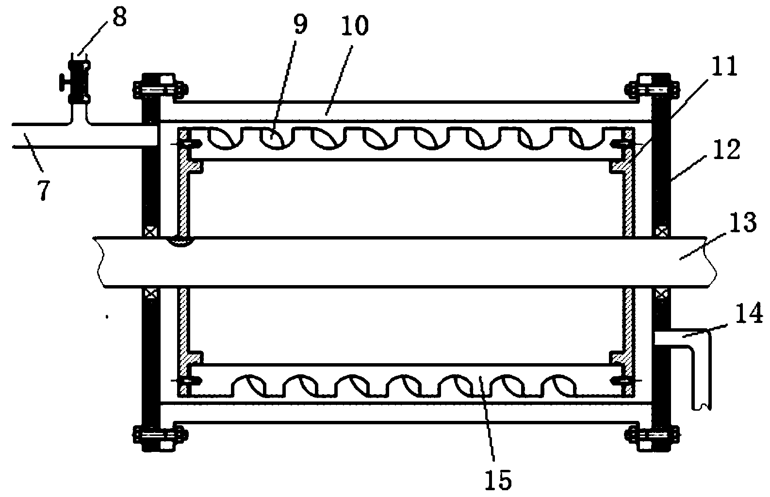 8.根據(jù)權(quán)利要求2所述的農(nóng)藥廢水芬頓試劑與水力空化聯(lián)合處理系統(tǒng),其特征是:所述螺旋槽的傾角為5°,寬度為30mm,深度為22mm。